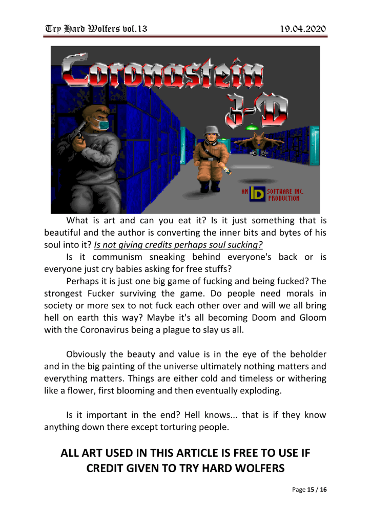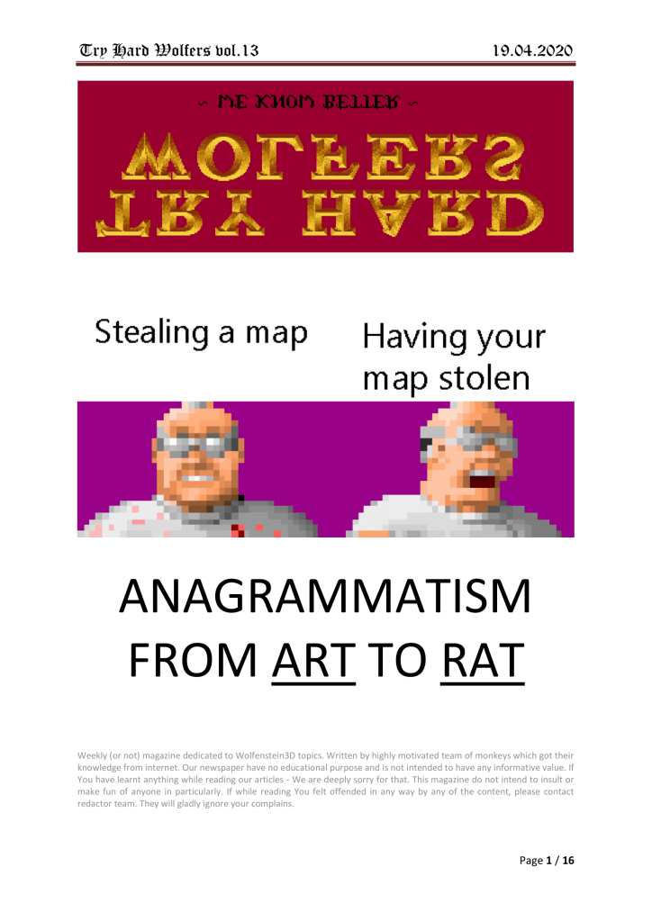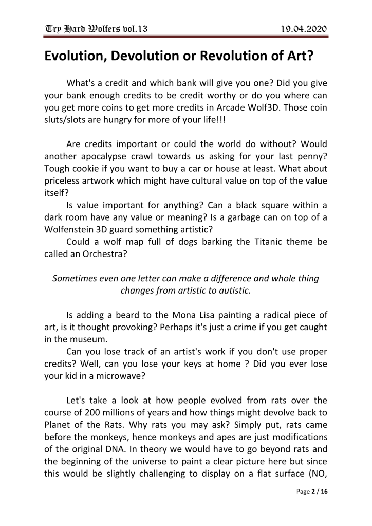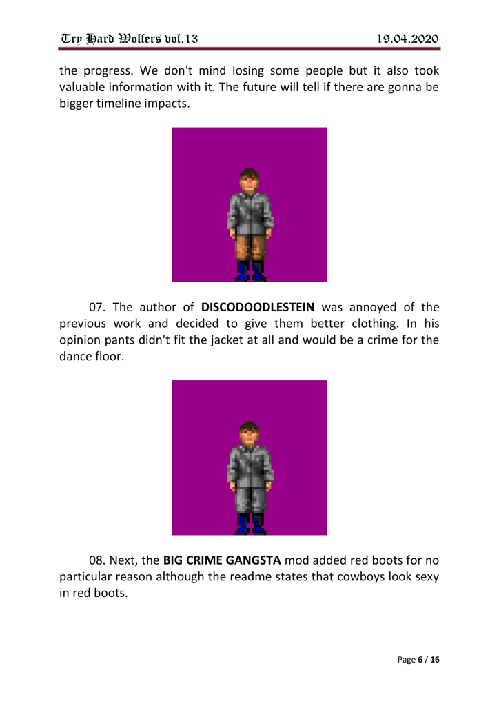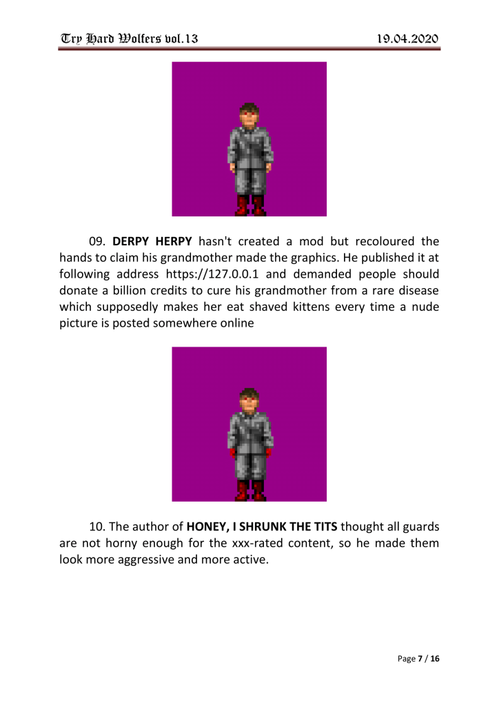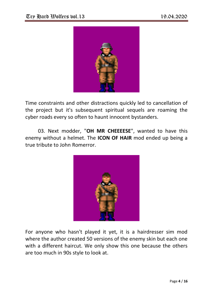Vol. 13 – 19th of April Posted bytryhardwolfApril 20, 2020Posted inUncategorizedTags:graphics, rats, Wolf3d, Wolfenstein 3D Share this: Share on X (Opens in new window) X Share on Facebook (Opens in new window) Facebook Like Loading... Related