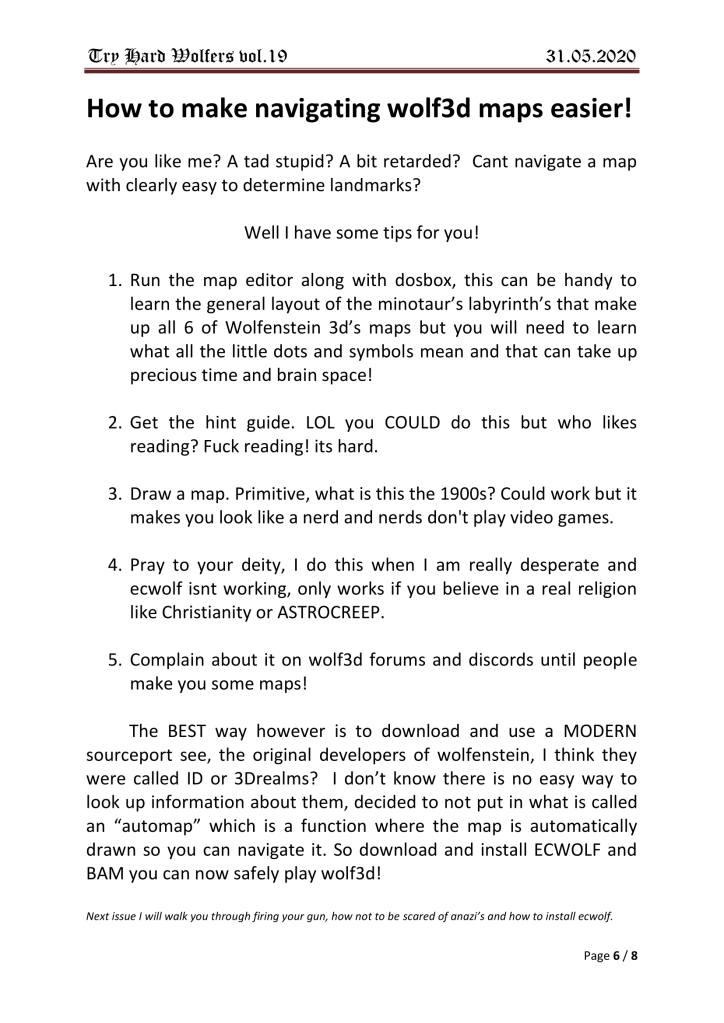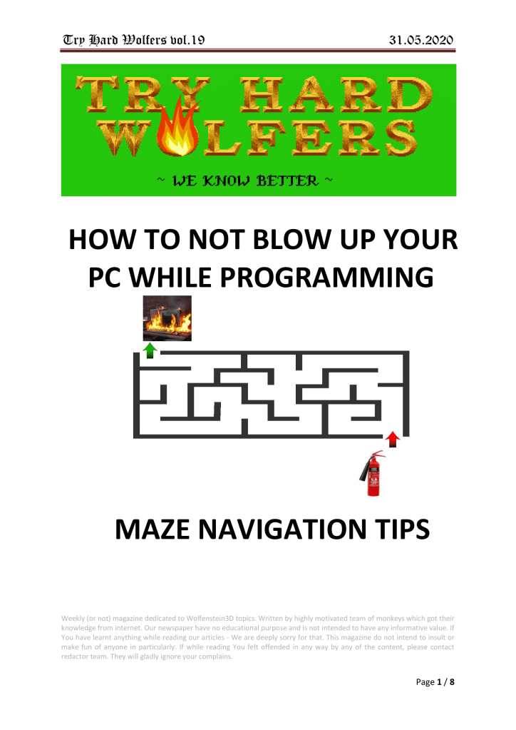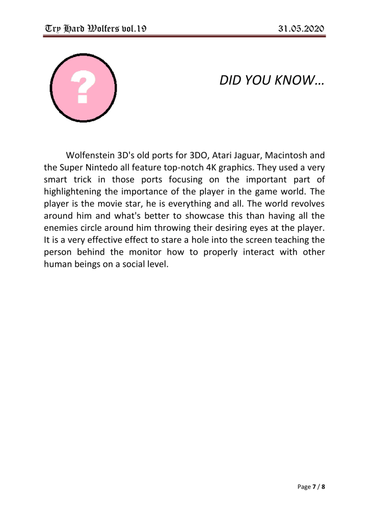 Vol. 19 – 31st of May Posted bytryhardwolfMay 31, 2020Posted inUncategorizedTags:code, programming, Wolf3d, Wolfenstein Share this: Click to share on X (Opens in new window) X Click to share on Facebook (Opens in new window) Facebook Like Loading... Related