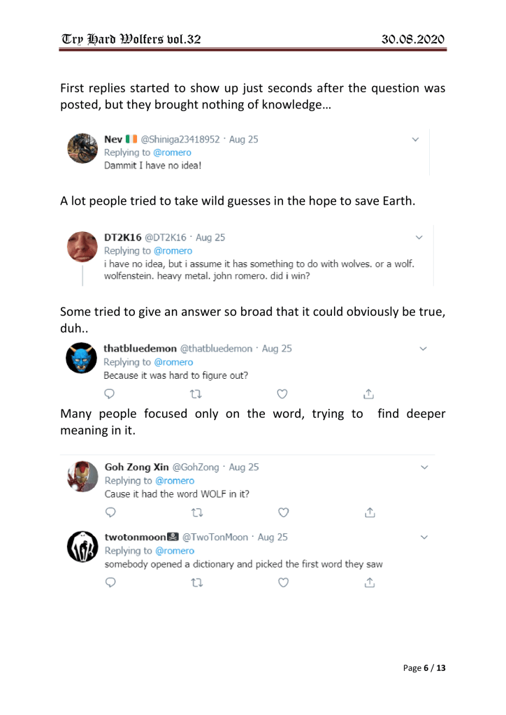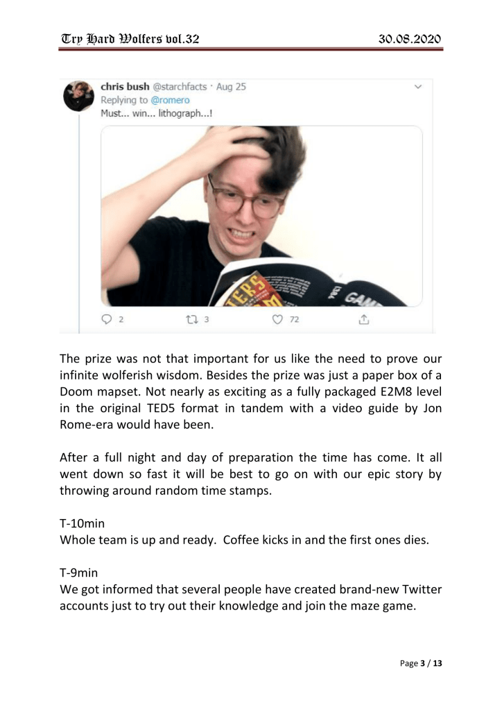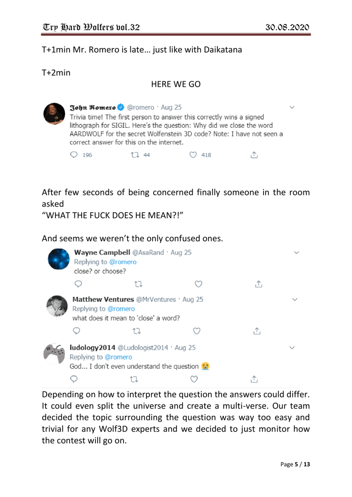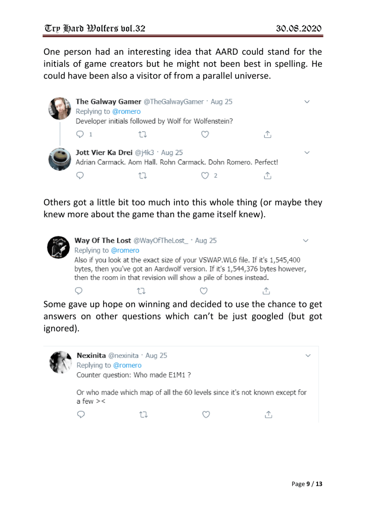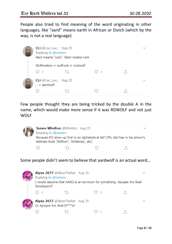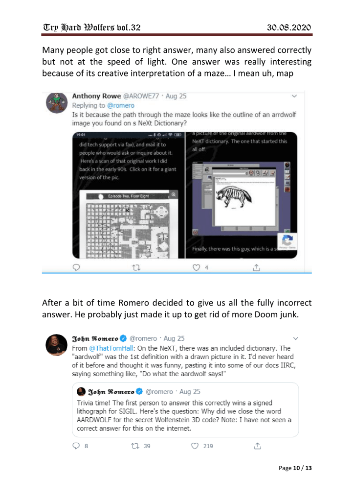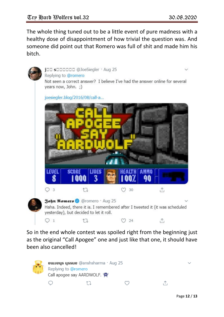 Vol. 32 – 30th of August Posted bytryhardwolfAugust 30, 2020Posted inUncategorizedTags:aardwolf, romero, twitter, Wolfenstein Share this: Share on X (Opens in new window) X Share on Facebook (Opens in new window) Facebook Like Loading... Related